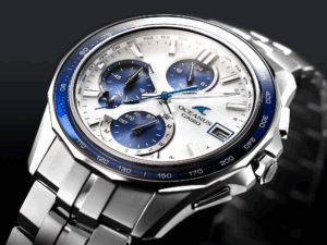 海を感じる爽やかでスポーティなカラーをデザインで取り込みました。メインダイアルに美しいホワイトを、インダイアル部に透過性のあるブルー蒸着を採用。ベゼル上のサファイアガラスにもブルー蒸着を施しています。標準電波受信機能による時刻修正に加え、スマートフォンリンクによる時刻修正機能などを搭載。これらの高機能を厚さ9.5mmのスリムケースに収め、薄く美しいフォルムも実現しました。