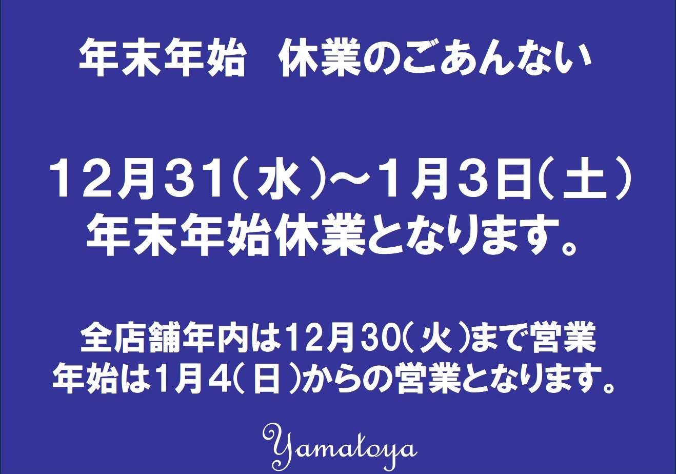 12月31日(水)~ 1月3日(土)の間、全店休業いたします。