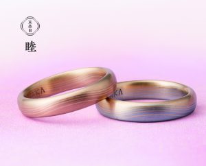 お二人が選んだ結婚指輪『京杢目・睦』は、ふたつのマテリアルが解け合うような模様で
