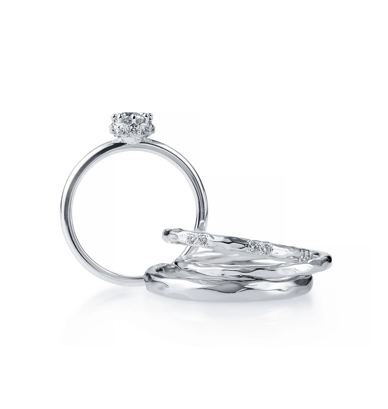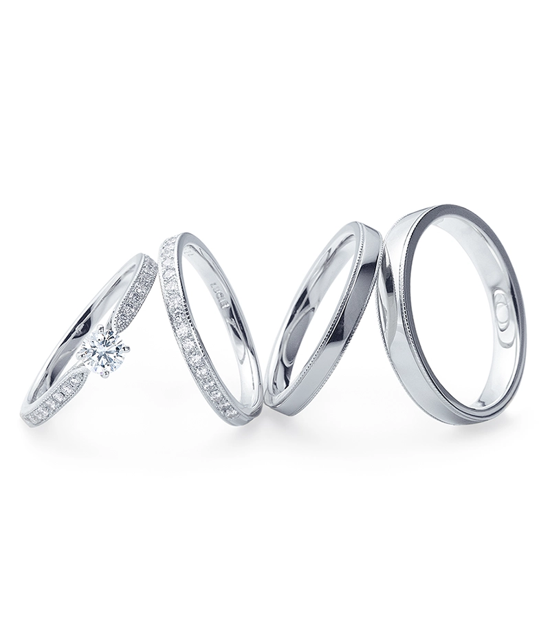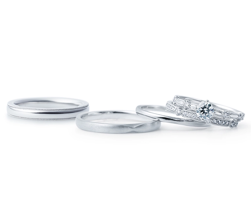 婚約指輪は、ダイアモンドの入り方が異なる2種類を展開。結婚指輪は、華やかなダイアモンド入りタイプと、すっきりとしたプレーンタイプなど、多彩なバリエーションが揃っています。